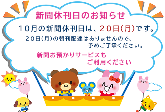 【休刊日のお知らせ】10月の新聞休刊日は、20日(月)です。20日(月)の朝刊配達はありませんので、予めご了承ください。