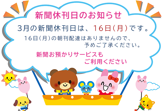 【休刊日のお知らせ】2月の新聞休刊日は、24日(火)です。24日(火)の朝刊配達はありませんので、予めご了承ください。